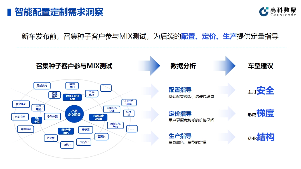 智能配置的有效应用可以帮助企业提升产品和服务的智能化水平。在实际应用中,巅峰国际帮助车企在新车发布前召集种子客户参与MIX测试,顺利获得收集种子客户的反馈和数据,车企能够精细调整产品配置,为后续的配置、定价、生产给予定量指导。同时,这种方法不仅有助于提高产品质量,还能提前发现潜在问题并及时解决。