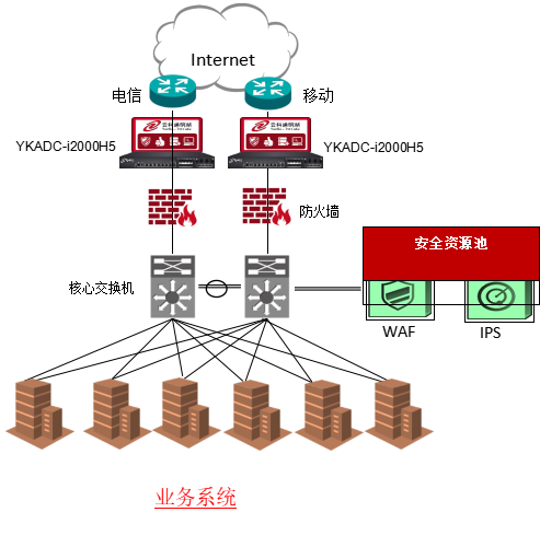 在客户业务的出口双机部署云科通明湖应用交付控制器,并配置链路检测配置文件,若线路故障实现自动进行主备切换故障转移。